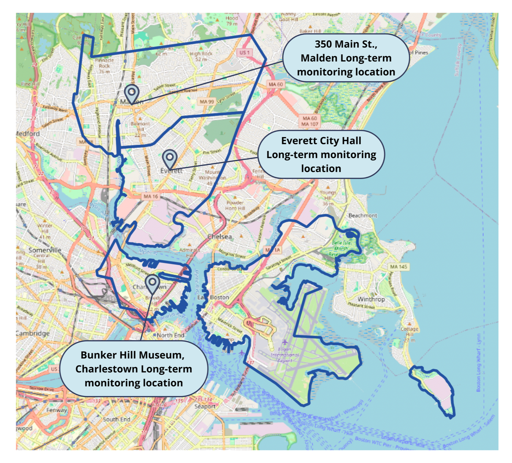 Map: CLEANAIR study communities outlined in blue with long-term monitoring locations indicated in Malden, Everett, and Charlestown. Long-term monitoring was not conducted in East Boston as part of this study due to the presence of other long-term monitoring efforts. Short-term monitoring efforts in Malden & Everett focused on impact of school traffic. Short-term monitoring efforts in Charlestown & East Boston were focused on the impact of major roadways that intersect the community.