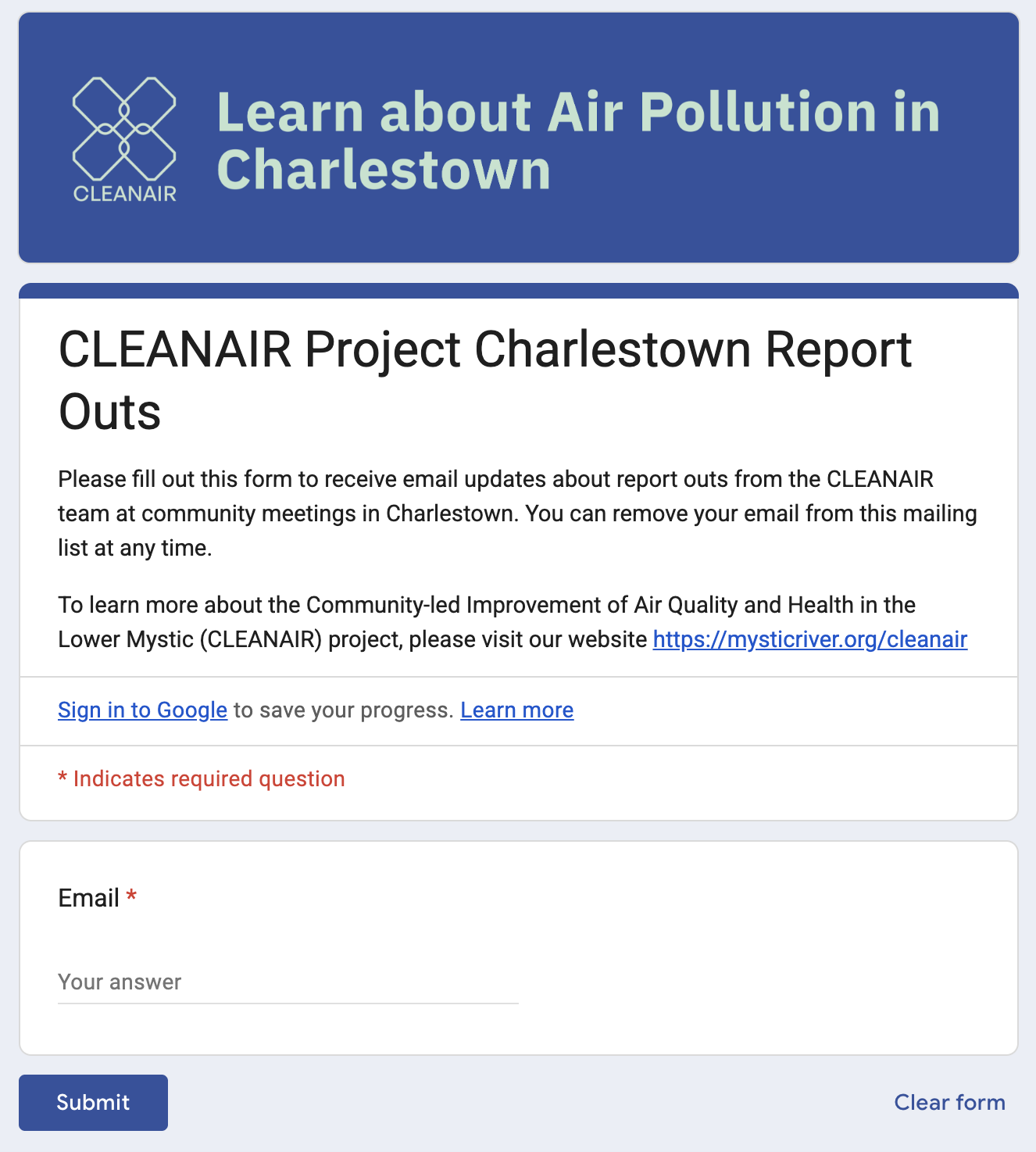 We will be reporting out in Charlestown in March at various community meetings. Fill out the interest form below if you would like to be notified of those opportunities to hear from the CLEANAIR team: