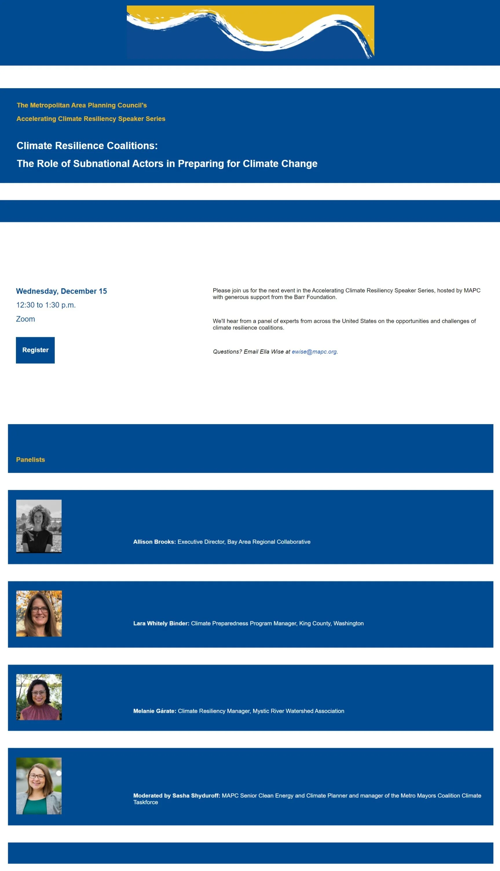 Check out the next event in MAPC’s Accelerating Climate Resiliency Speaker Series ft. MyRWA Climate Resiliency Manager, Melanie Gárate! Details and Zoom registration below:
