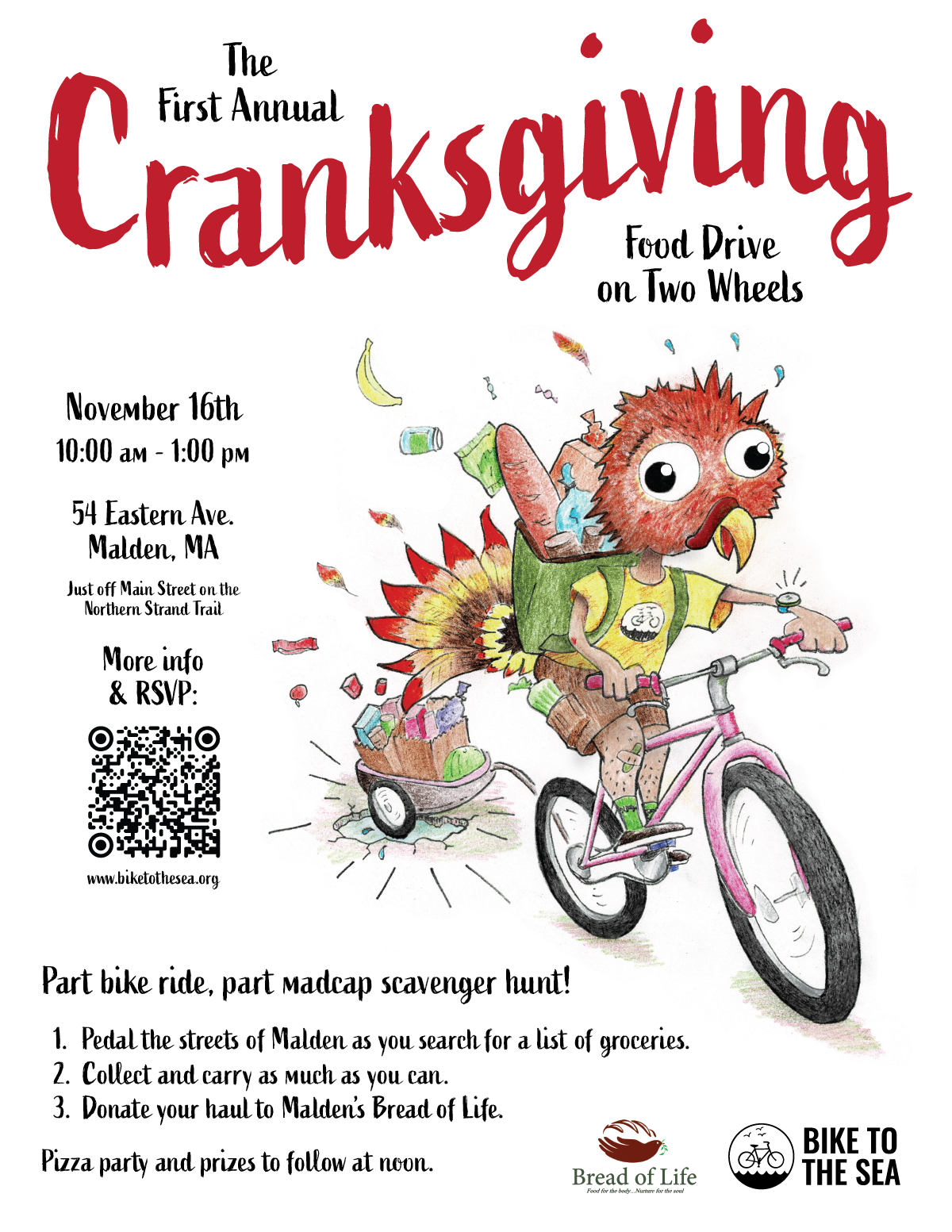 Bike to the Sea is hosting the First Annual Cranksgiving Food Drive on Saturday, November 16th from 10:00 am - 1:00 pm. This event will be part bike ride, part scavenger hunt to collect groceries for Malden’s Bread of Life to help combat food insecurity.