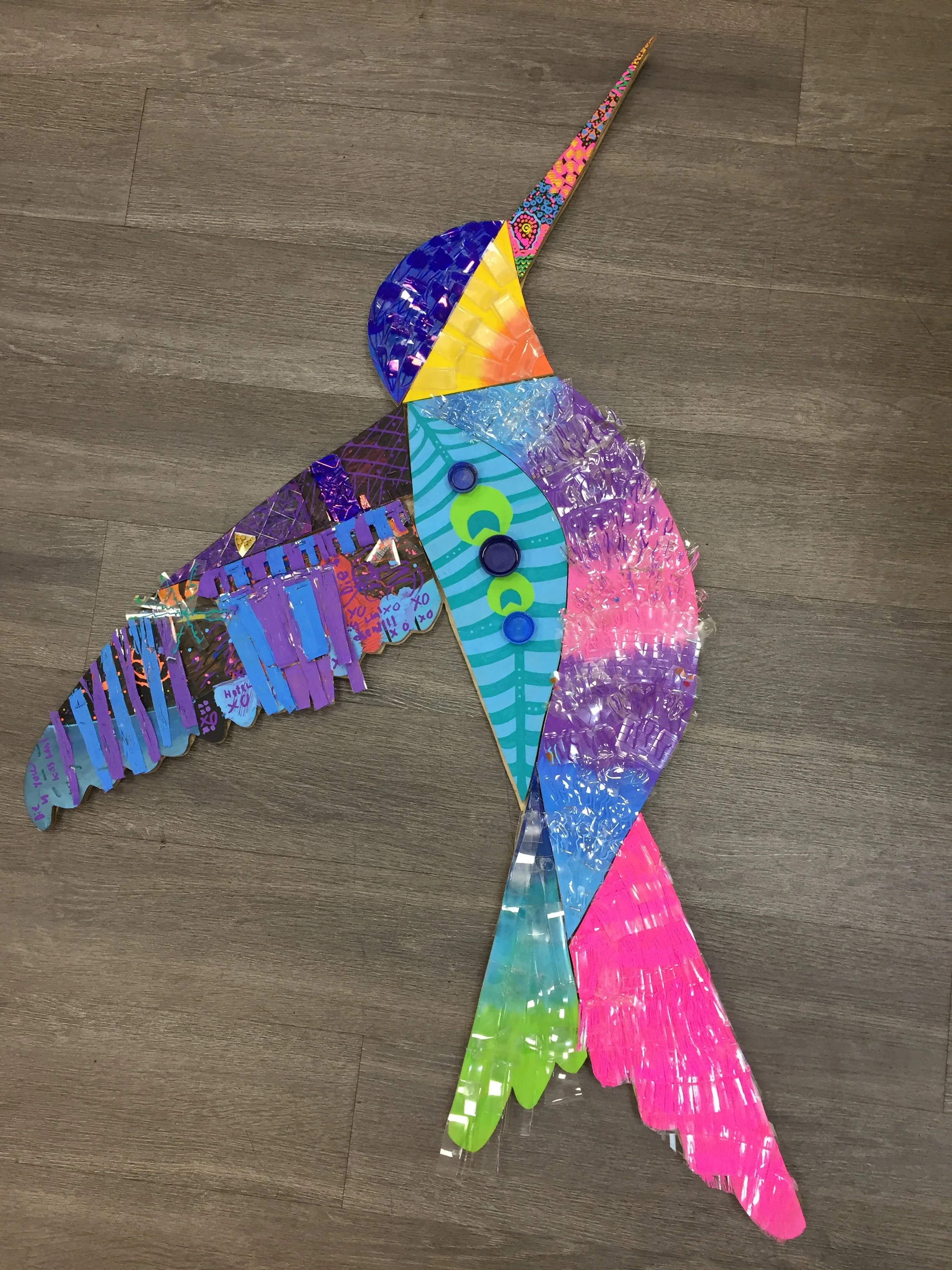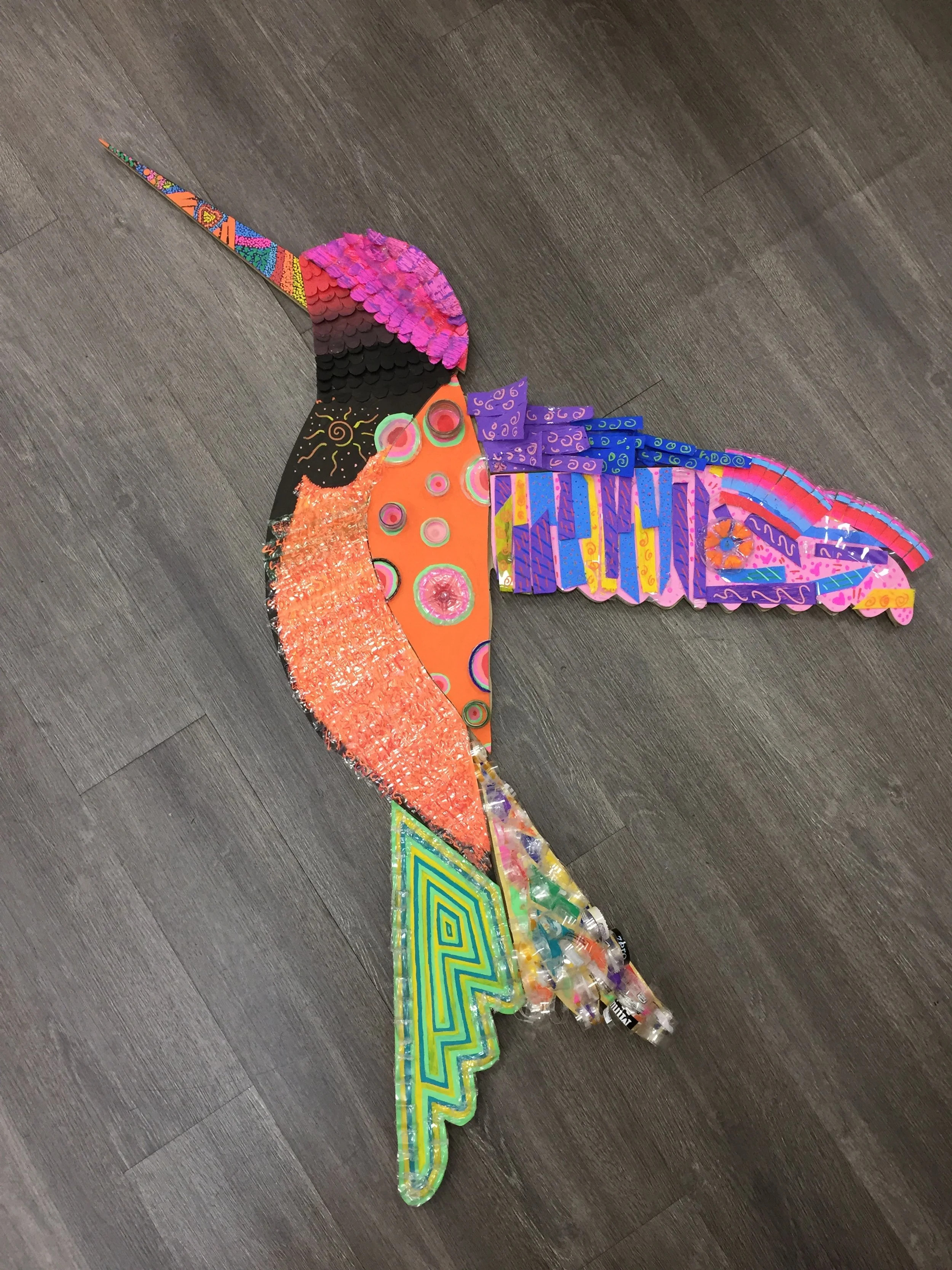 La Colaborativa youth using trash collected from around Island End River to make hummingbird sculptures. Credit: Carolyn Lewenberg.