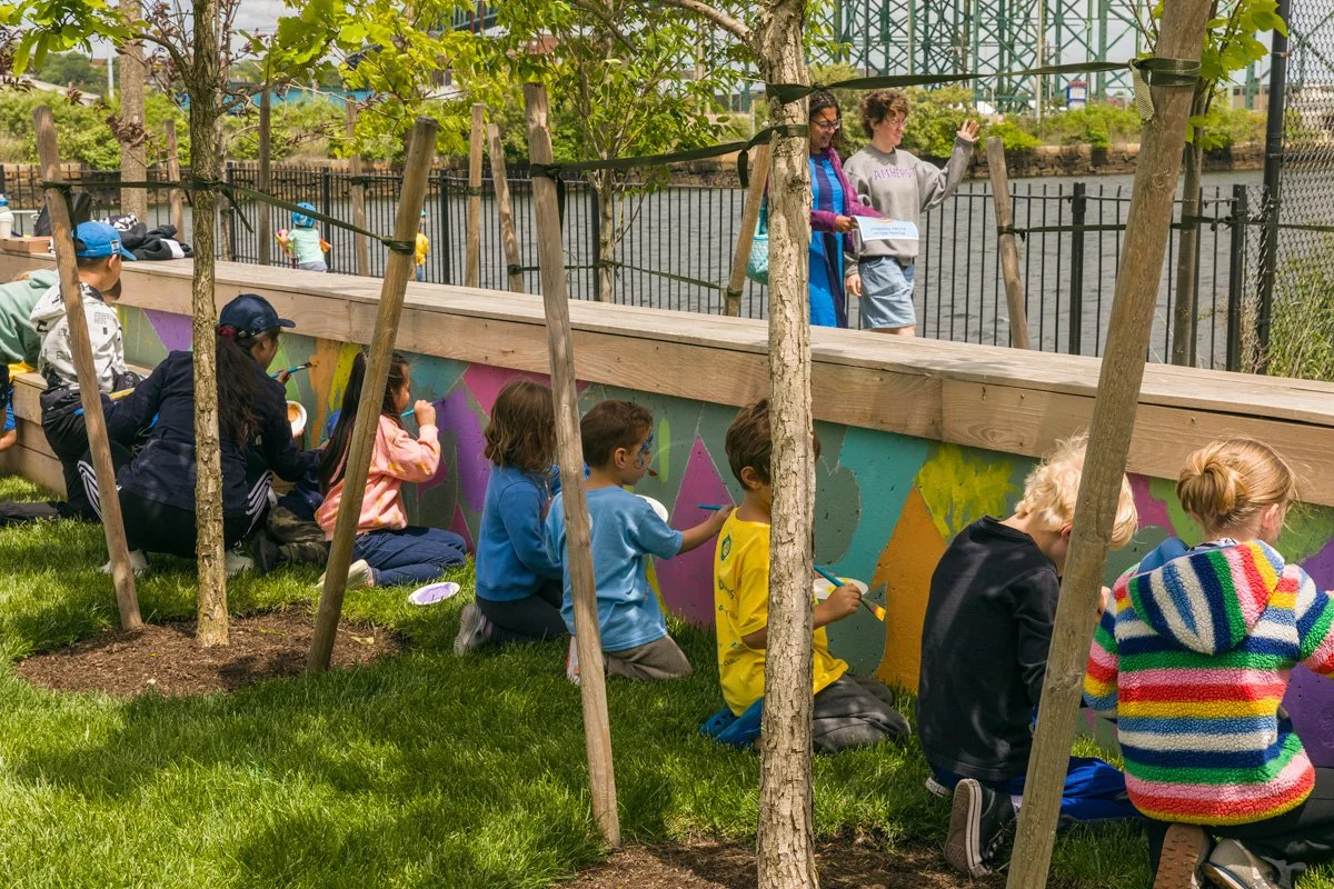 Kids paint a mural during the grand opening of the Little Mystic Plaza, across the channel from the Boat Ramp, in 2025. Credit: David Mussina