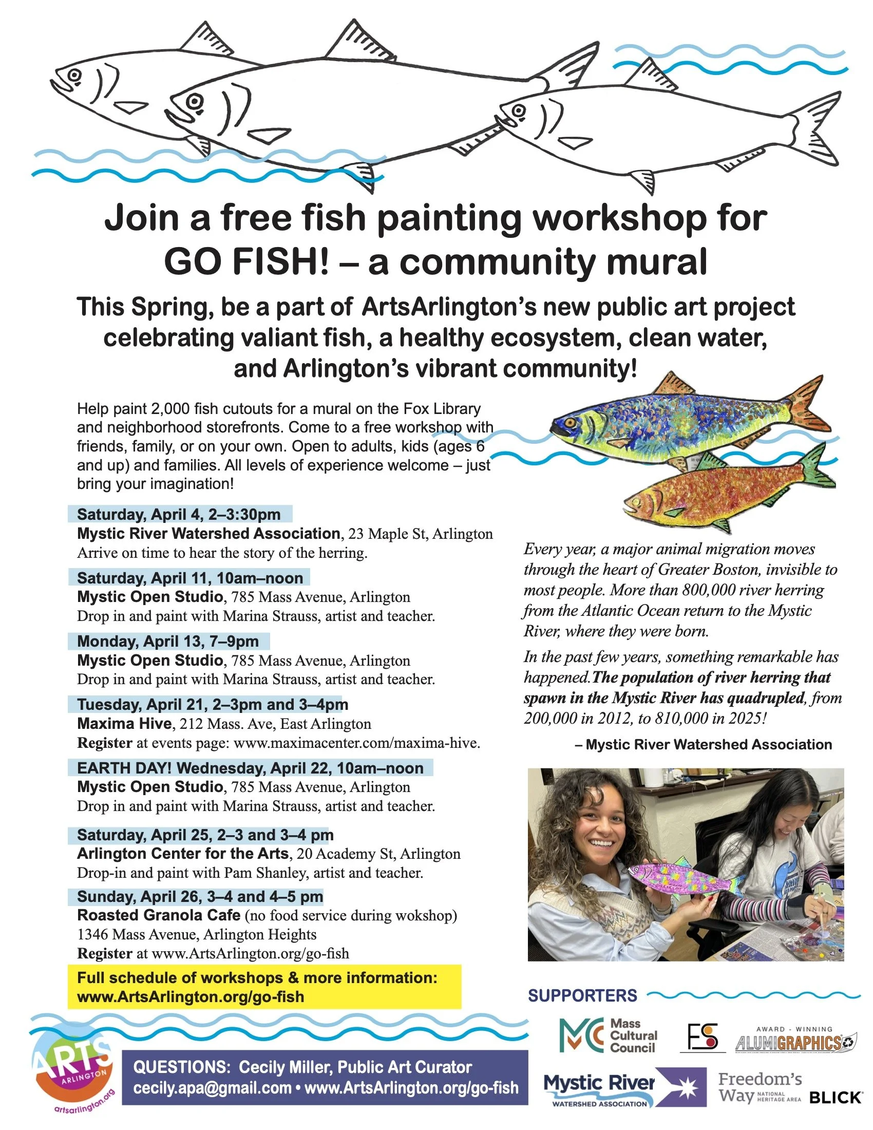 The Mystic River Watershed Association and ArtsArlington are teaming up for GO FISH! — a participatory public art project celebrating the heroic herring of the Mystic River! These free events are open to all ages and levels of experience; all materials are provided. We invite you to speak up — through art — for the importance of environmental stewardship, wildlife protection, and a vibrant, creative, diverse community. With your help, two thousand individually painted fish will swim across the brick walls of East Arlington storefronts this June! Children under 12 must be accompanied by an adult.